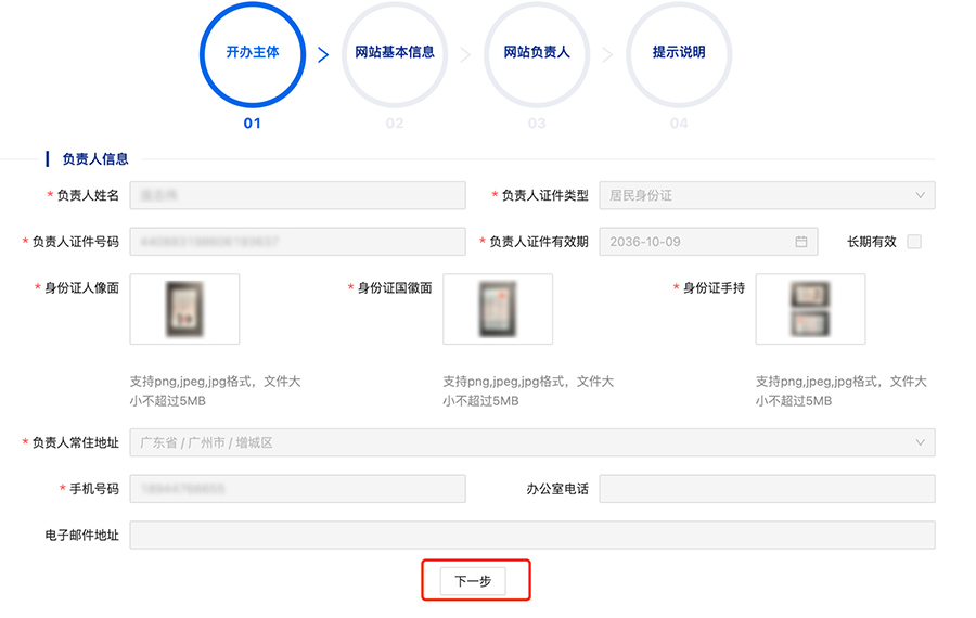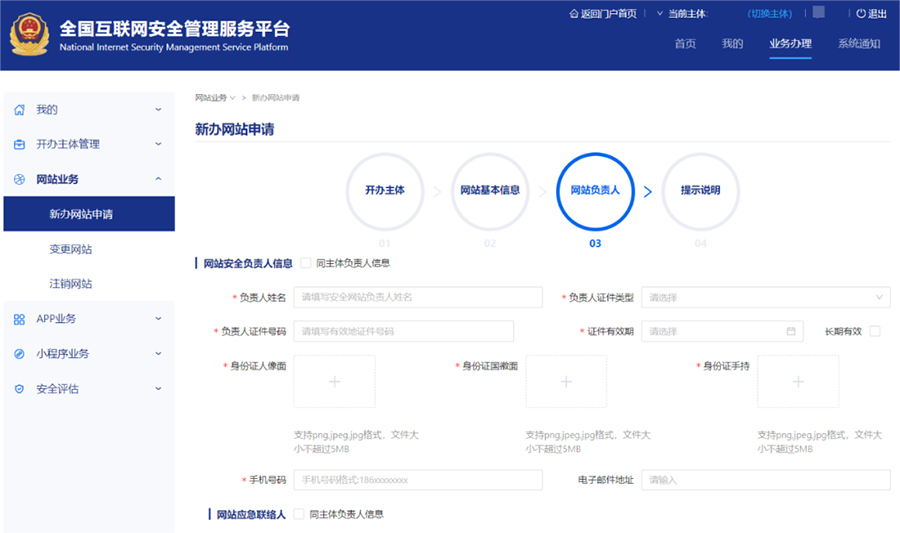 網站負責人默認同步主體負責人的資料,如果企業的網站負責人與主體負責人不是同一人,則需要另外準備網站負責人的證件材料。
