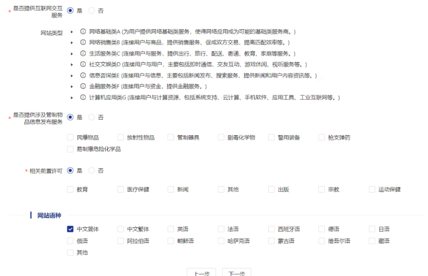 服務類型:根據用戶自己情況選擇填寫。需要注意的是:網站服務類型是否為交互式的選擇,交互式服務指為互聯網用戶提供信息發布、交流互動等服務,包括但不限于論壇、網絡購物、在線支付等服務類型。單位門戶網站一般屬于非交互式,不涉及論壇、網絡購物、在線支付等服務。我們的網站遇到這幾類選擇,統一都選否。