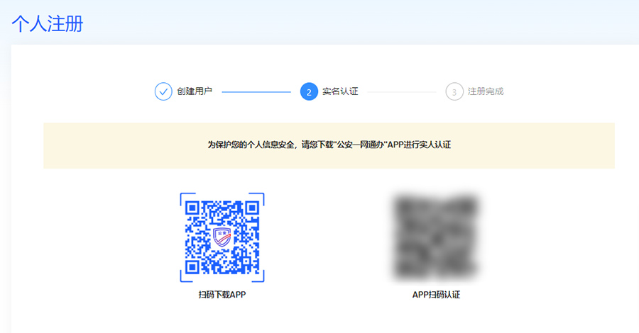 4、根據彈出二維碼驗證頁面,請先掃描左側二維碼下載“公安一網通辦” APP,再使用該 APP 掃描右側二維碼進行實人認證。完成互聯網站安全服務平臺的賬號注冊。