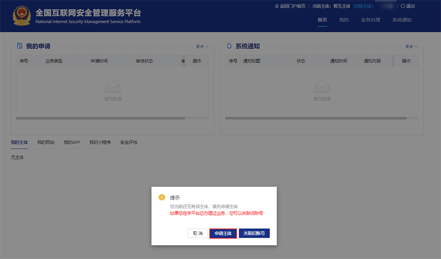 1、在彈出的提示窗口中或登錄 新增主體 頁,進行申請主體。如下圖所示: